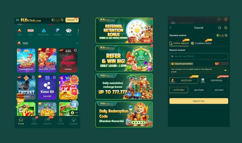 K6 Club Game also gives VIP levels with extra bonuses, lower fees, and higher limits. You get lucky spin wheels, weekly tournaments, festival offers (Eid specials), live chat help, push notifications for big wins, and a full wallet history to track every rupee. The graphics and sound effects feel premium while the app stays light on battery and data.
